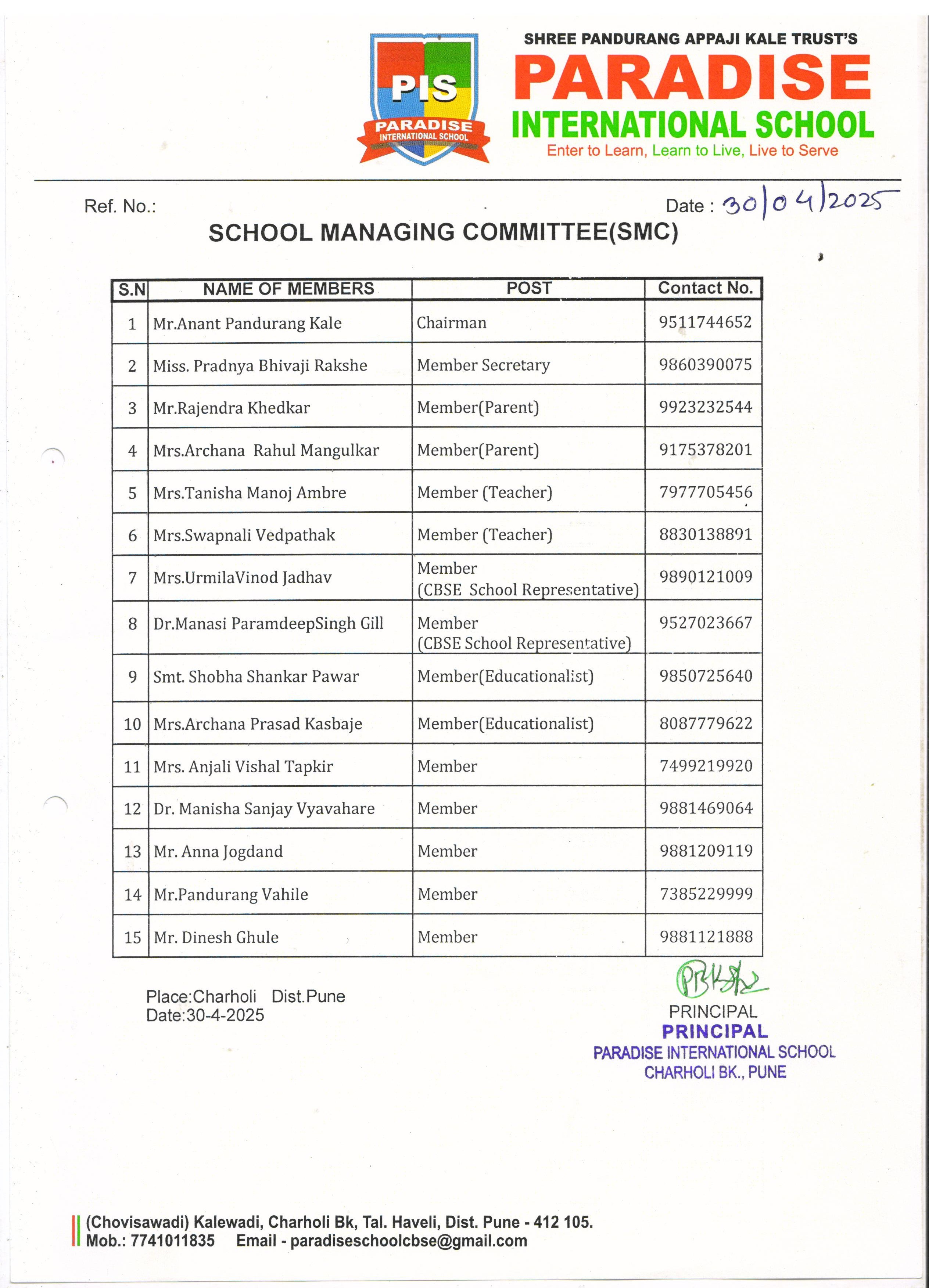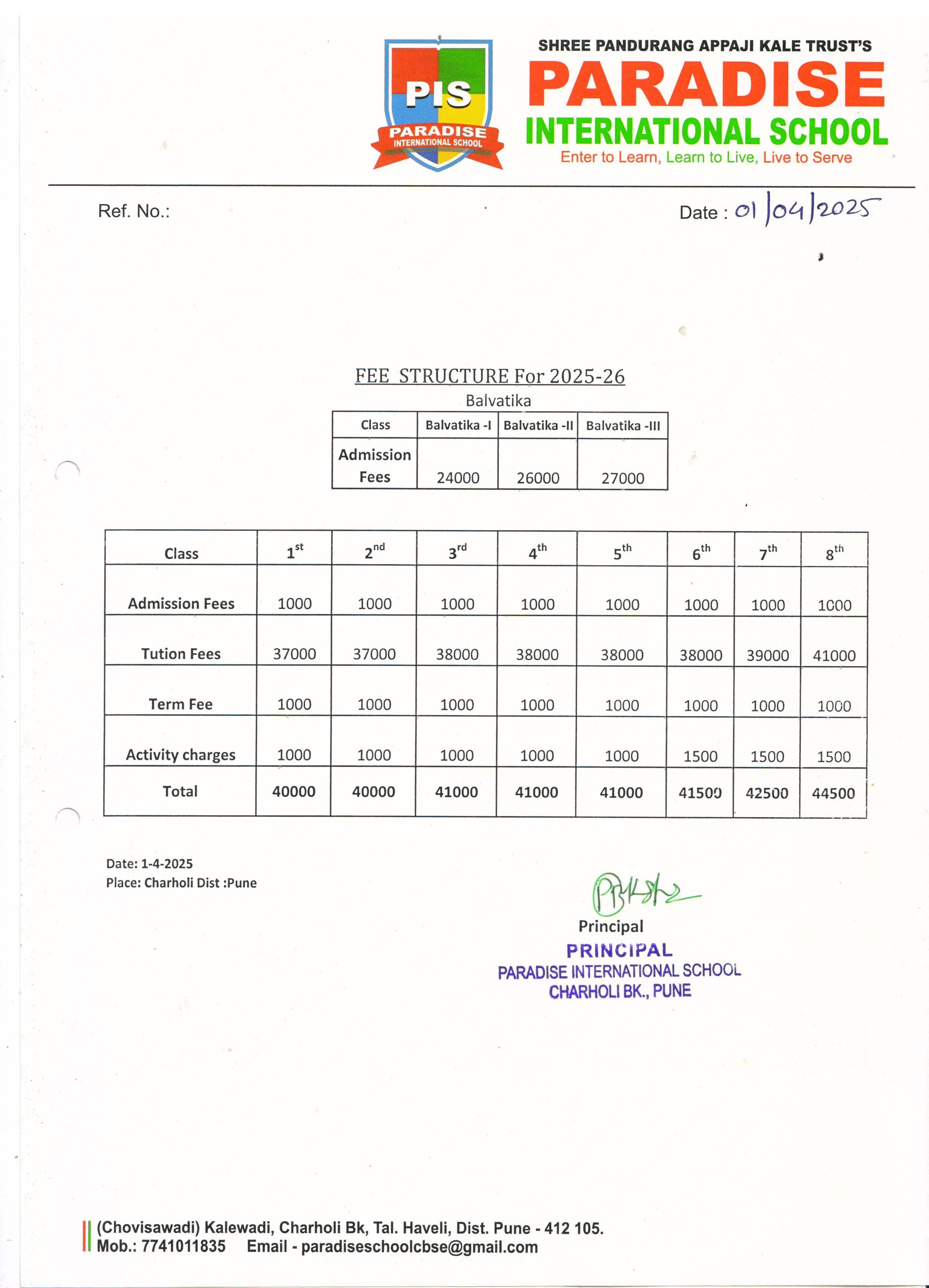 Paradise International School, (Chovisawadi), Kalewadi, Charholi Bk, Tal- Haveli , Dist.- Pune , 412105 |